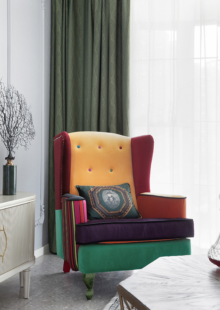 ▲ 單人沙發(fā)高級感十足,綠紅黃紫,撞色撞出了華麗麗的復(fù)古風(fēng)。