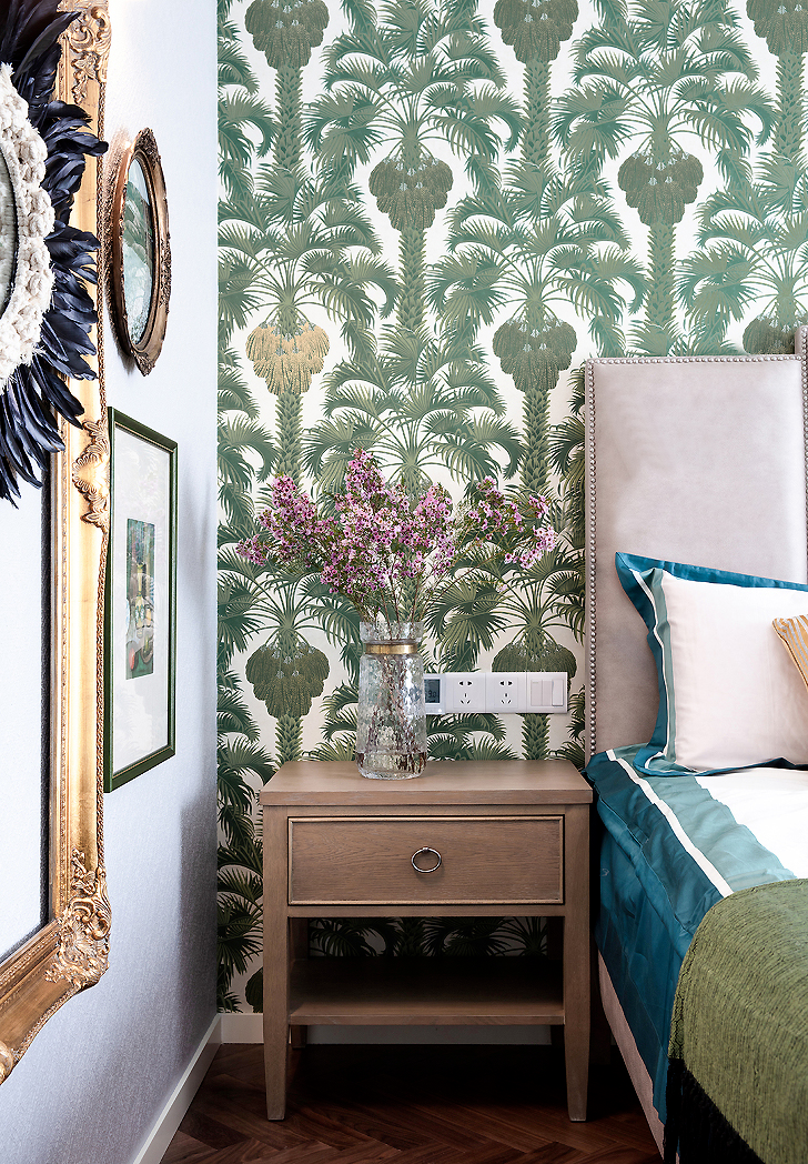 ▲ 主臥,綠植圖案的背景墻加以金色抱枕的點綴,與窗簾色調(diào)相呼應(yīng)。人字形地板鋪貼,在視覺上有拉伸空間的效果,增添優(yōu)雅高級的質(zhì)感。