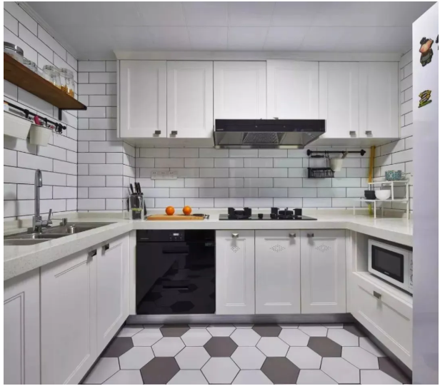 在一些比較歐美式的廚房,白色櫥柜門帶上紋理的話,結(jié)合仿古磚的搭配,整個空間會顯得更加優(yōu)雅大方。