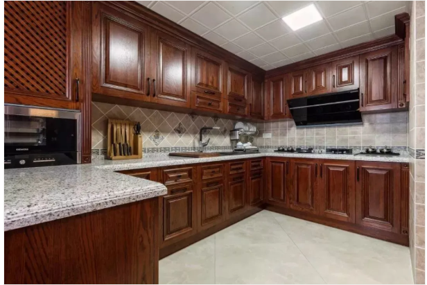 而在中式、美式等風(fēng)格的廚房,則可以選擇實木的櫥柜門板,整體效果更佳端莊高檔,適合有一定經(jīng)濟(jì)條件的家庭。