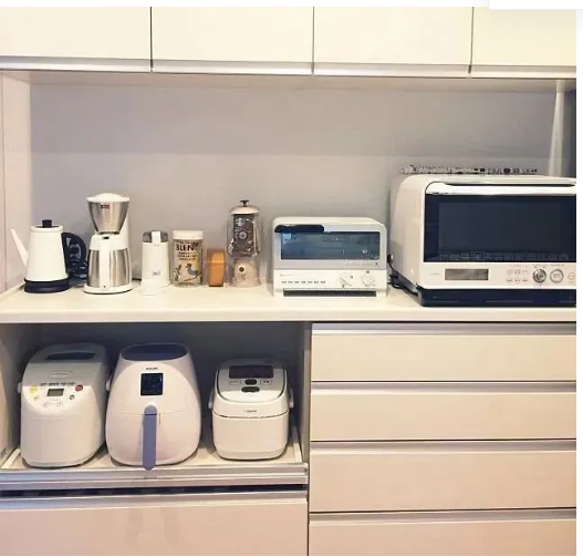 這一點(diǎn)也是考慮到小型電器在這里更方便操作,可以不費(fèi)力的取出、存放。相比于放在廚房臺(tái)面占地方或放入柜門中取用過程繁瑣,這一設(shè)計(jì)的確十分討喜。
