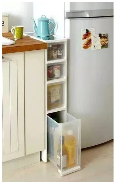 這一方法是針對(duì)廚房櫥柜有空隙的家庭,通過一個(gè)可移動(dòng)的夾縫處收納架彌補(bǔ)這里的空缺,并且通過底部滑輪的方式增加靈活性??梢苿?dòng)的夾縫收納架有點(diǎn)類似小推車,隨用隨取,移動(dòng)方便。